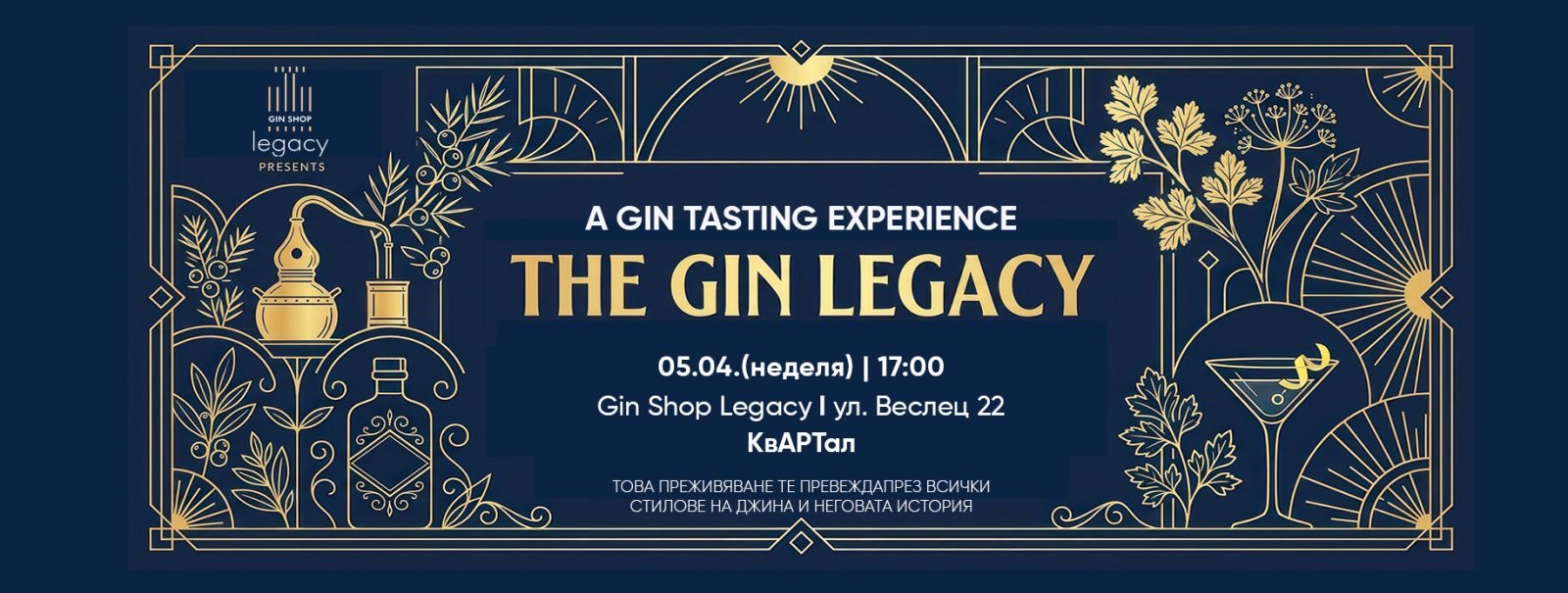 На 05.04.2026 г. от 17:00 ч. в Gin Shop Legacy ви каним на първото ни дегустационно събитие — THE GIN LEGACY.